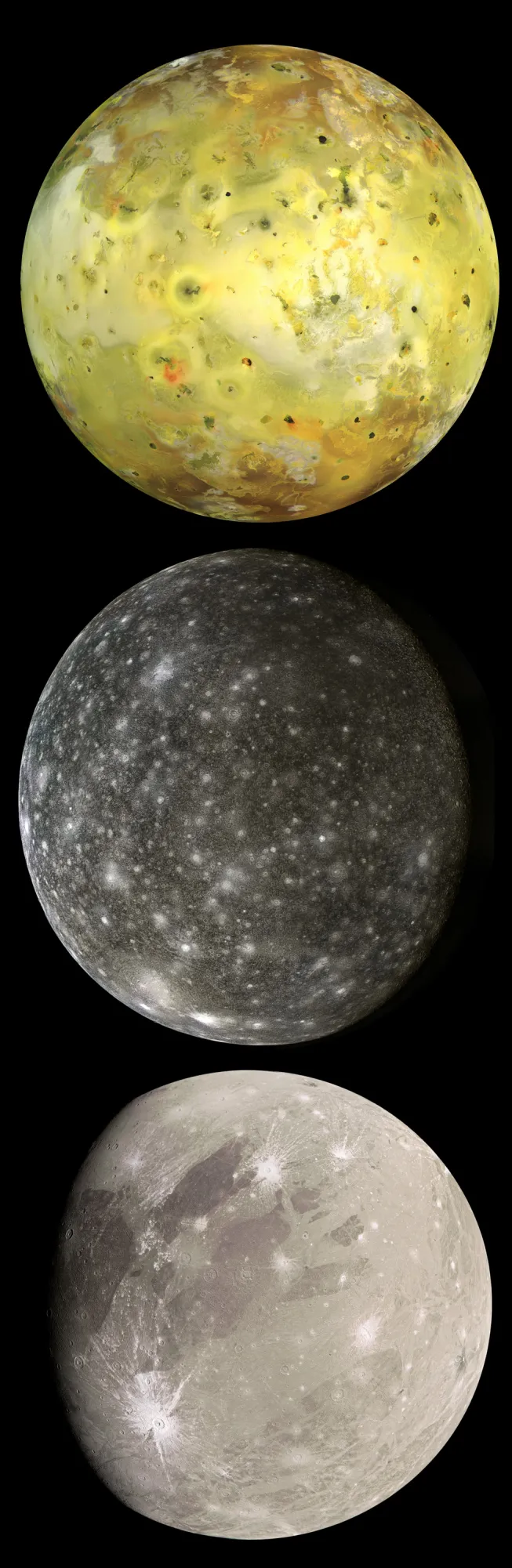 NASA/JPL/UNIVERSITY OF ARIZONA (IO); NASA/JPL-CALTECH/KEVIN M. GILL (CALLISTO); NASA/JPL-CALTECH/SWRI/MSSS/KEVIN M. GILL (GANYMEDE¡)
