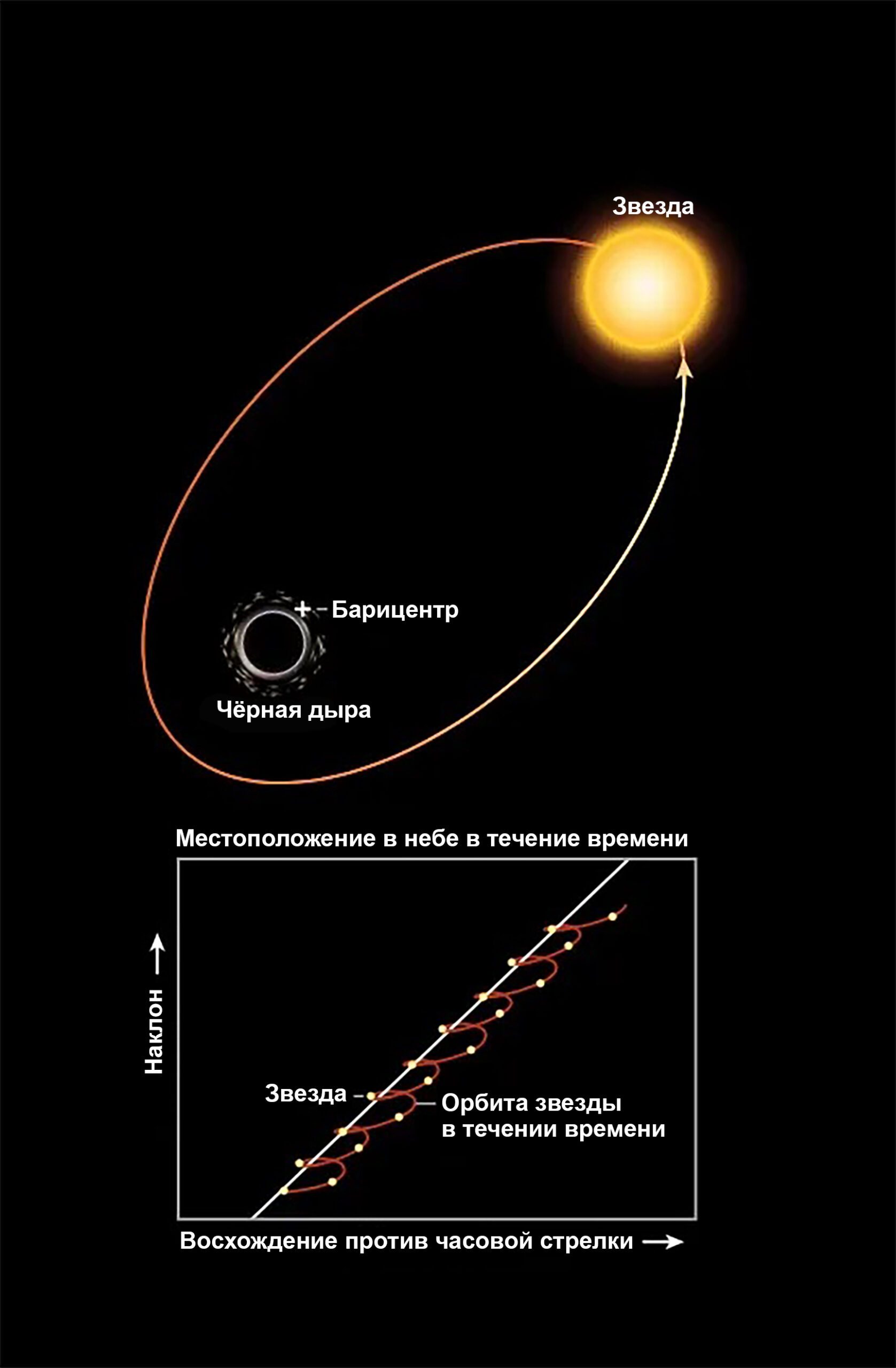 Звезда в бинарной системе с невидимой чёрной дырой проявляет очевидное колебание в космосе, если следить за ней достаточно долго. Gaia измеряет это колебание, непрерывно сканируя в двух направлениях одновременно, чтобы измерить положение каждой звезды с точностью около 20 угловых микросекунд. Изображение: Astronomy: Roen Kelly