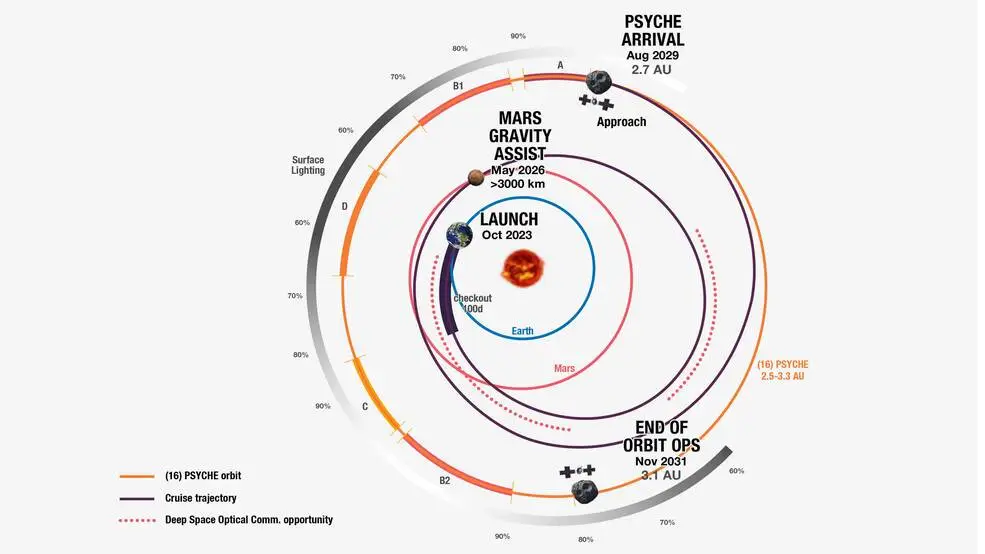 На шляху до астероїда Psyche встигне зробити проліт повз Марс навесні 2026 року, щоб здійснити гравітаційний маневр.