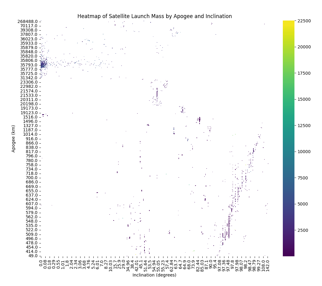 На цій тепловій мапі ми можемо побачити два основних скупчення. Перше має апогей приблизно від 500 до 1300 км і нахил орбіти від 97 до 108 градусів — це супутники на полярних та сонячно-синхронних орбітах. Друге скупчення має нахил від 0 до 7 градусів і розташоване на висотах від 19 тисяч до 36 тисяч км — це супутники на геосинхронних орбітах. Є також невелике скупчення супутників на низьких навколоземних орбітах з нахилом від 30 до 68 градусів.