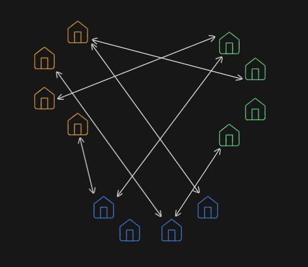 Давайте поглянемо, як працює логістика. Уявімо, що ми хочемо організувати обмін посилками між містами А, Б і В. Найпростіший варіант — це відправка посилок напряму (Мал. 3), замовивши таксі, яке доставить ваш пакунок з міста А (будинок 1) в місто Б (будинок 2).