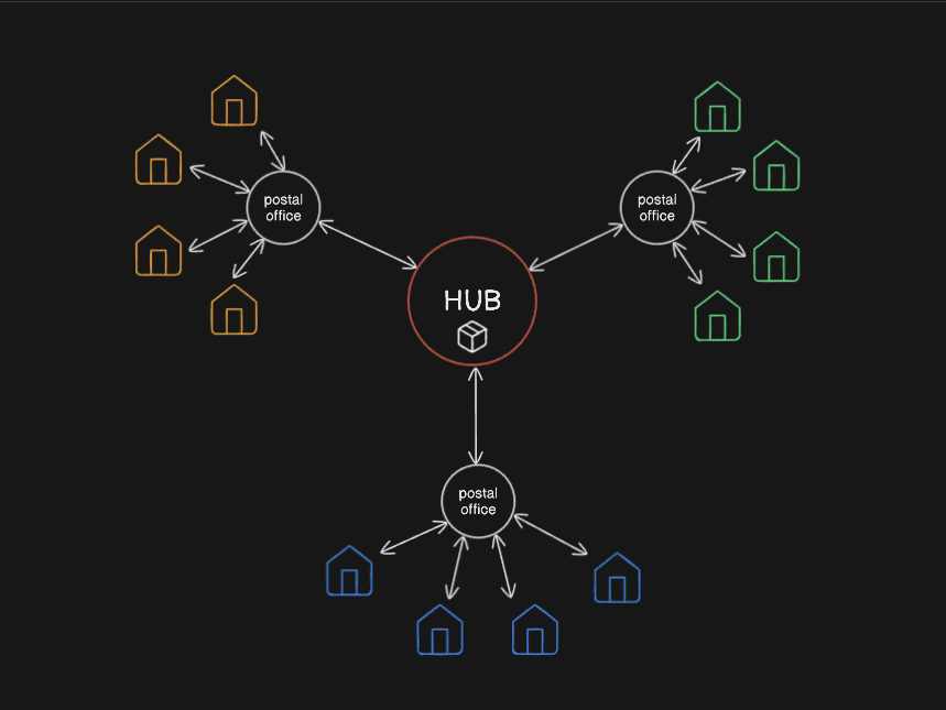 Але одразу видно проблему: доставка пакунка між містами на таксі буде надто дорогою. Тому всі служби доставки користуються іншим підходом: спочатку кур’єри збирають посилки у відділеннях, потім їх перевозять до розподільчих центрів, звідки вони відправляються до потрібних міст. Далі кур’єри вже доставляють посилки до адресатів. При цьому для далеких поїздок використовують великі вантажівки, оскільки їхня вартість перевезення за кілограм значно нижча.