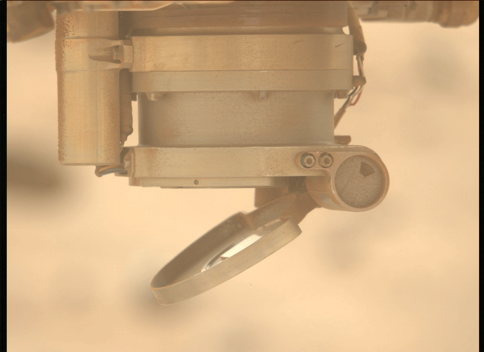 Зображення, зроблене навігаційною камерою на борту марсохода NASA Perseverance 23 січня, показує тодішнє положення кришки об’єктива на інструменті SHERLOC. Згодом кришку вдалося відкрити; наразі інструмент продовжує наукову роботу. Фото: NASA | JPL-Caltech