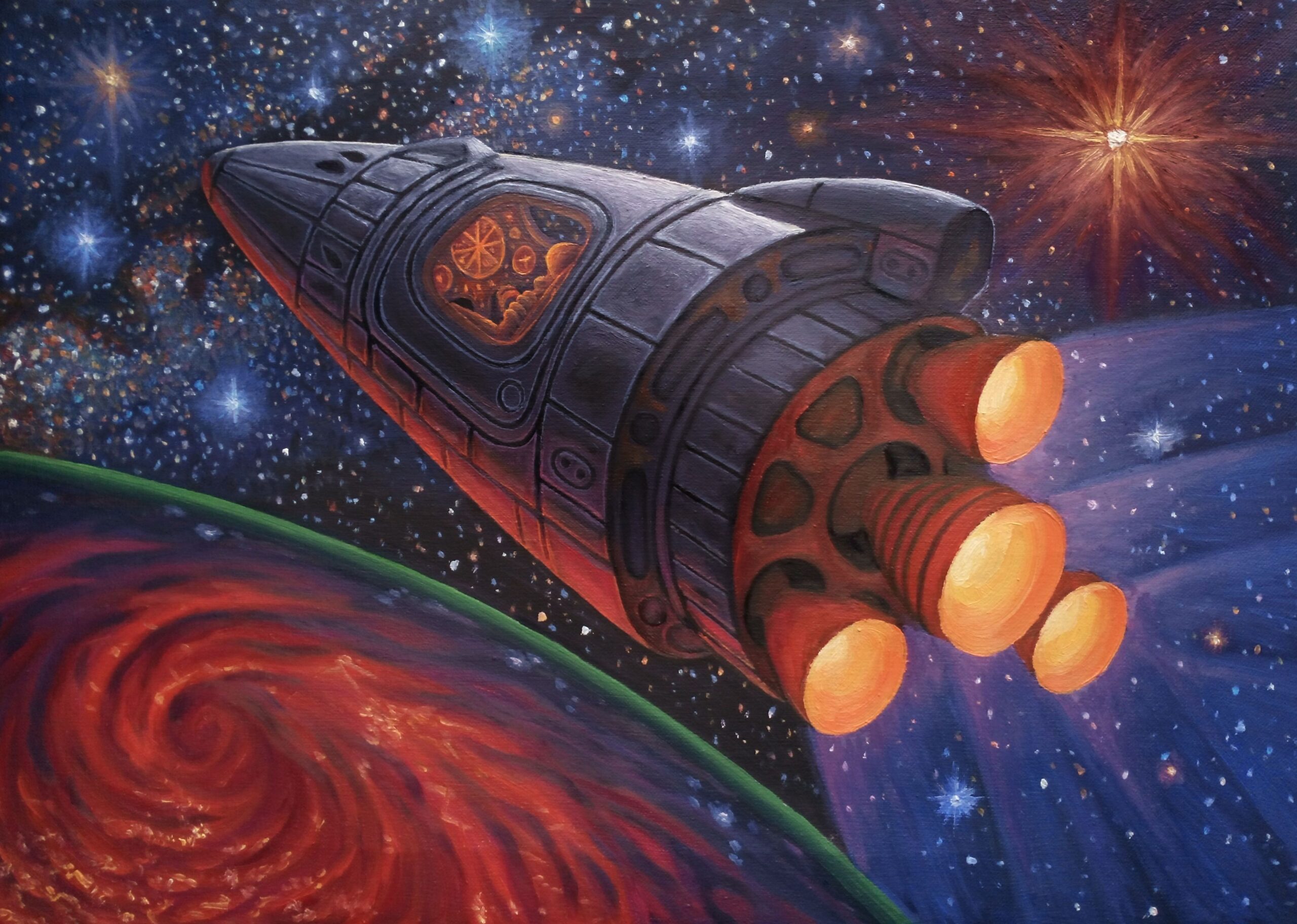 Міжпланетний ядерний космічний корабель на іонній тязі, 70х40см, олія на полотні.
