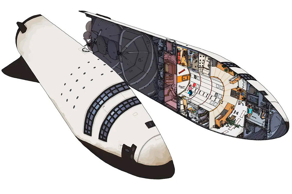 Цікаво, що в загальному доступі мінімум описів конструкції та компонування пілотованого Starship. У SpaceX переважно обмежуються художніми зображеннями зовнішнього вигляду такого космічного корабля. Головним чином, зустрічаються ескізи «на вільну тему», автори яких очевидно надихалися фантастичними фільмами на кшталт 2001: A Space Odyssey або концепцією орбітальної станції Skylab. Як відомо, у 70-х роках минулого сторіччя Skylab створювали на основі блока S-IVB, чи третього ступеню ракети-носія Saturn V. Враховуючи близькі розміри S-IVB (довжина 17,8 м, діаметр 6,6 м) і вантажного відсіку Starship (довжина 17 м, внутрішній діаметр 8 м), логічним було використання ідей компонування внутрішнього простору Crew Starship у стилю Skylab. Тому в інтернеті часто зустрічаються ескізи «багатопалубної» структури з чималими пілотськими кабінами (часом навіть з панорамними вікнами).