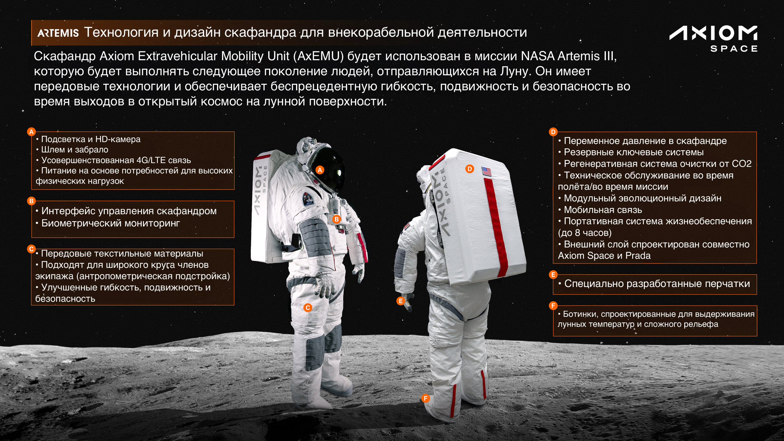 16 октября на Международном астронавтическом конгрессе компания Axiom Space и дом высокой моды Prada презентовали скафандр Axiom Extravehicular Mobility Unit (AxEMU), который стал результатом их сотрудничества. Астронавты будут использовать его во время миссий программы Artemis к Луне – в том числе и для выхода на поверхность нашего спутника.