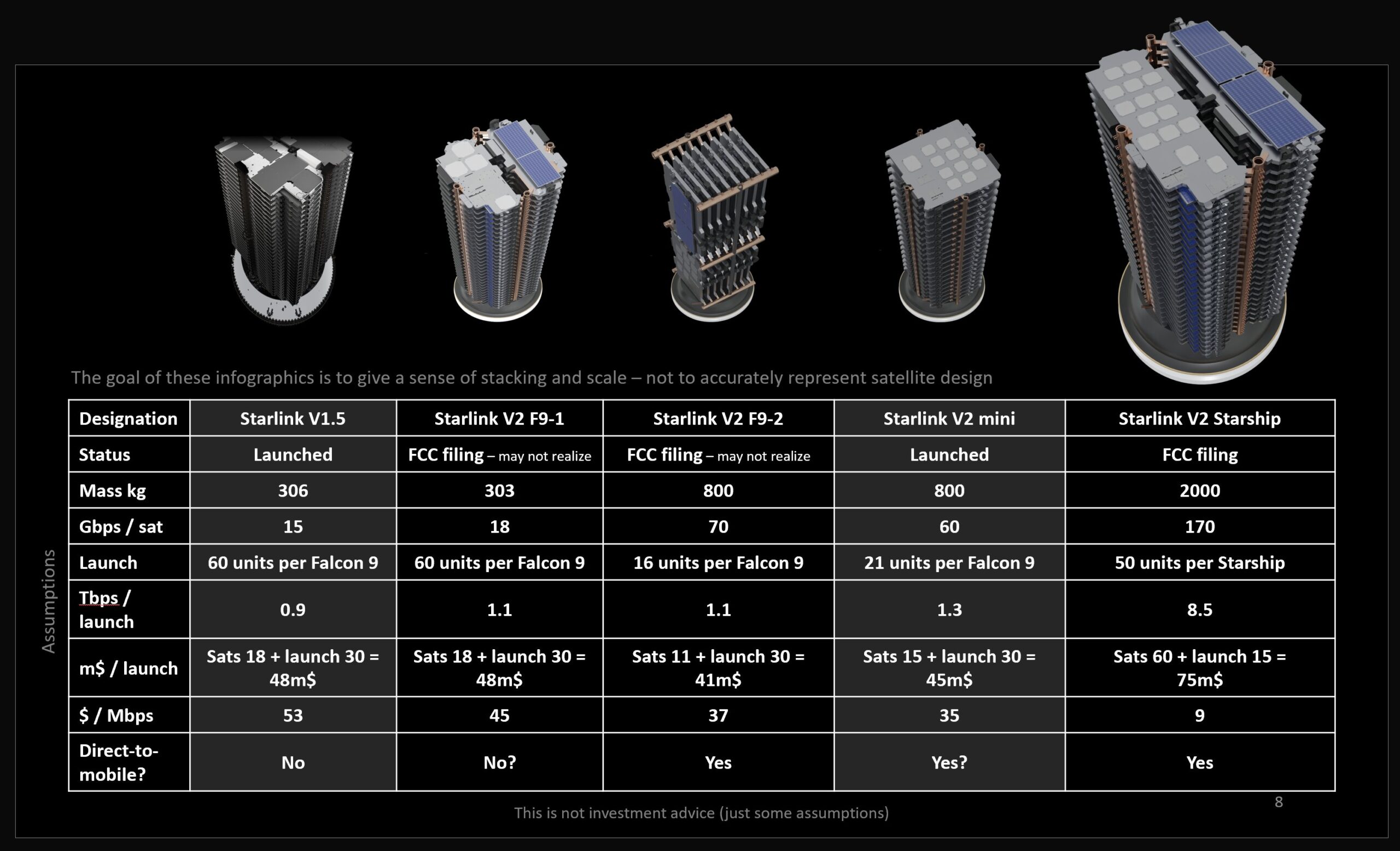 Порівняльна таблиця (спекулятивних) спроможностей супутників Starlink різних поколінь. Credit: Julien Villa-Massone