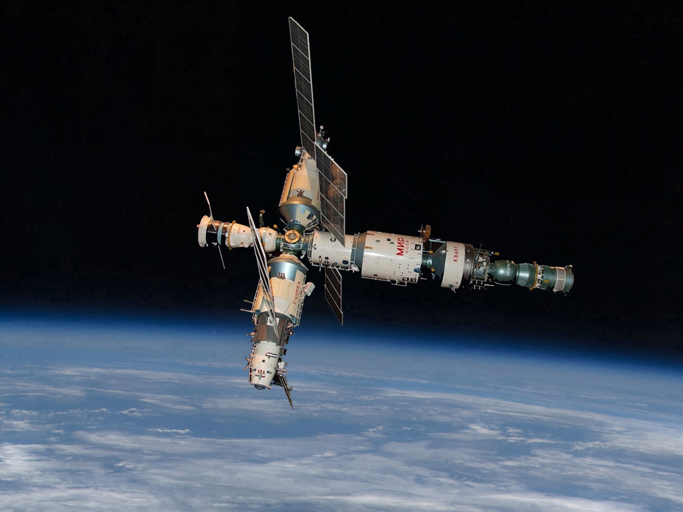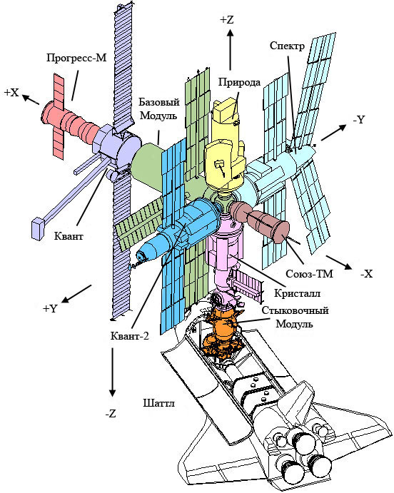 В 1986 году на орбиту был выведен базовый блок, а в течение следующих десяти лет к нему присоединили 5 модулей: “Квант” (1987 г.), “Квант-2” (1989 г.), “Кристалл” (1990 г.), “Спектр” (1995 г.), “Природа” (1996 г.) с приборами для наблюдения за атмосферой и земной поверхностью.
