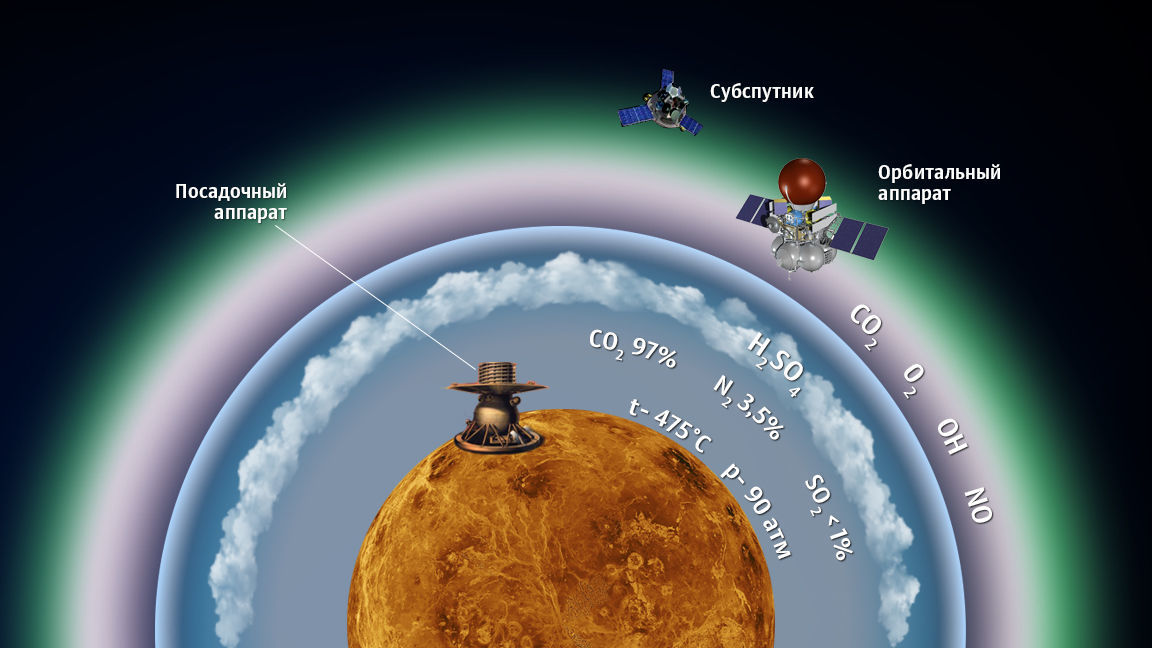 2. Посадочный аппарат – изучение состава атмосферы и облаков Венеры, анализ грунта на поверхности планеты. Срок его работы упоминается просто как «короткий».
