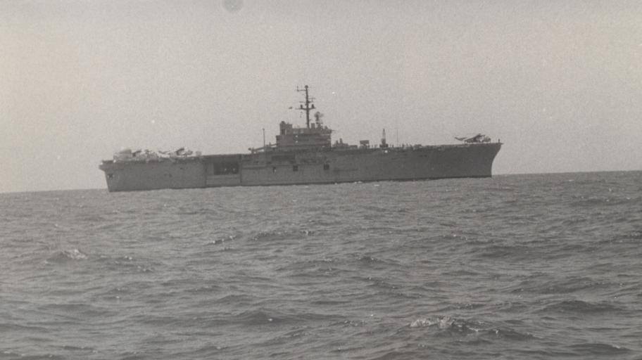 И вот однажды на утренней вахте я, на свою голову, обнаружил на экране локатора крупную цель. Пошли на сближение. Оказалось, что это американский авианосец «Окинава» (фото). Сразу же доложили, куда надо. Нам ответили: во-первых, это не авианосец, а вертолетоносец (а то бы сами не догадались); во-вторых, он во главе сил, обеспечивающих приводнение «Аполло-15», возвращающегося с Луны; в-третьих, покинуть свой район, «прилипнуть» к «Окинаве», следить, наблюдать и прочее. Для «прочего» на борту была спецкоманда, в помещение которой мог заходить только командир.