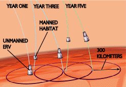 Вначале, на Марс будет отправлен ERV (Earth Return Vehicle – Аппарат для Возвращения на Землю) в момент сближения красной планеты с Землёй по наиболее энергоэффективной траектории. На борту ERV будут загружены большие пустые баки для топлива (типа – связка метан + жидкий кислород), два ровера, 6 тонн водорода, ядерный реактор на 100 кВт мощности и автоматическая химическая лаборатория. Для посадки ERV на Марс будет использованы тепловой щит, большой парашют и немного топлива для конечного торможения.