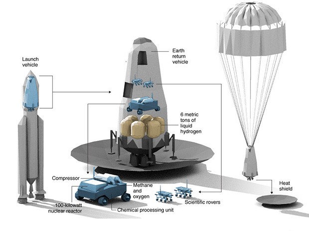 Вначале, на Марс будет отправлен ERV (Earth Return Vehicle – Аппарат для Возвращения на Землю) в момент сближения красной планеты с Землёй по наиболее энергоэффективной траектории. На борту ERV будут загружены большие пустые баки для топлива (типа – связка метан + жидкий кислород), два ровера, 6 тонн водорода, ядерный реактор на 100 кВт мощности и автоматическая химическая лаборатория. Для посадки ERV на Марс будет использованы тепловой щит, большой парашют и немного топлива для конечного торможения.
