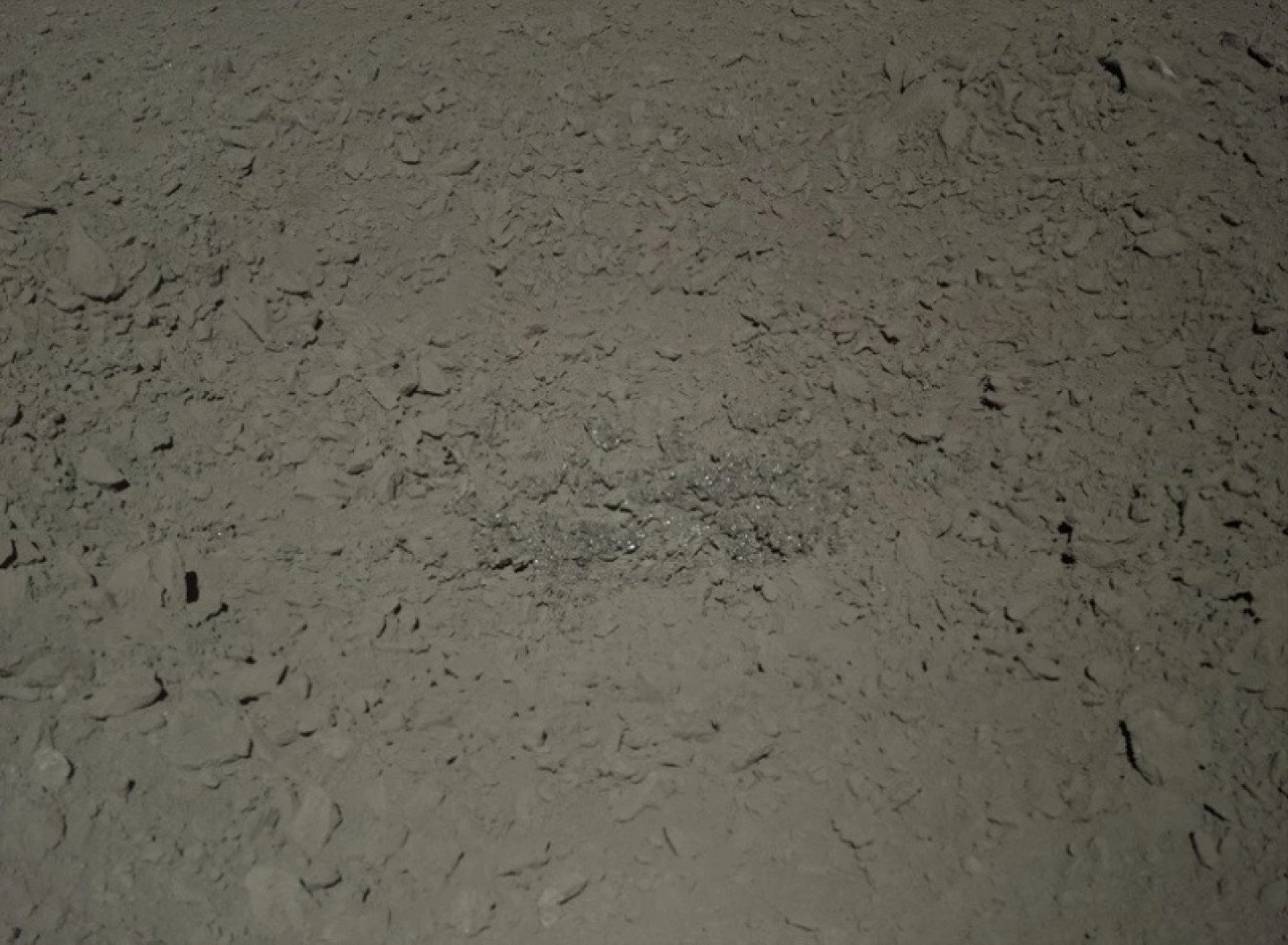 На фотографии видно, что материал сильно выделяется на фоне лунного грунта. Сейчас с помощью спектрометра проводится исследование химического состава материала и природы его происхождения.
