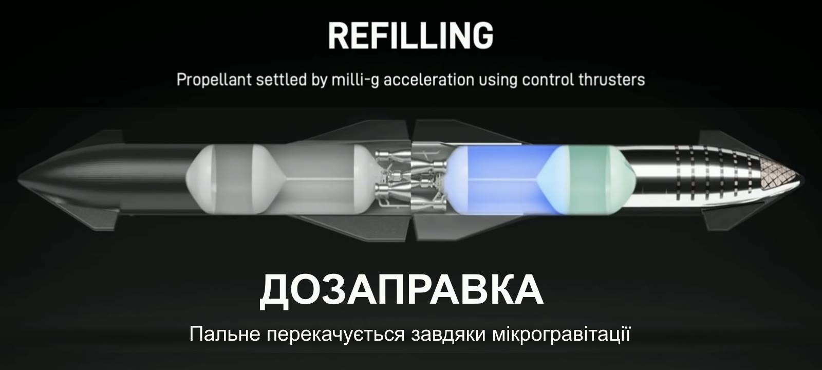 На мультиплікаційній моделі, починаючи з відмітки 01:00, ми бачимо процедуру, яку NASA і SpaceX наразі вважають ключовим моментом майбутніх міжпланетних подорожей. Це дозаправка ракетоплана на орбіті. Спочатку, з Землі стартує пасажирський лайнер Starship з екіпажем і припасами для міжпланетної місії. Під час виведення на орбіту тієї сто-тонної махини, вона випалює майже все паливо, що було на борту, і летіти на Марс просто нема чим. Тому лайнер чекає на зустріч зі схожим на Starship кораблем-танкером. Танкер, що запускається приблизно в той же час, що і сам Starship, наздоганяє міжпланетний корабель і вони стикуються. В доволі цікавий спосіб, який може викликати посмішку. Стиковка відбувається “корма-до-корми”.