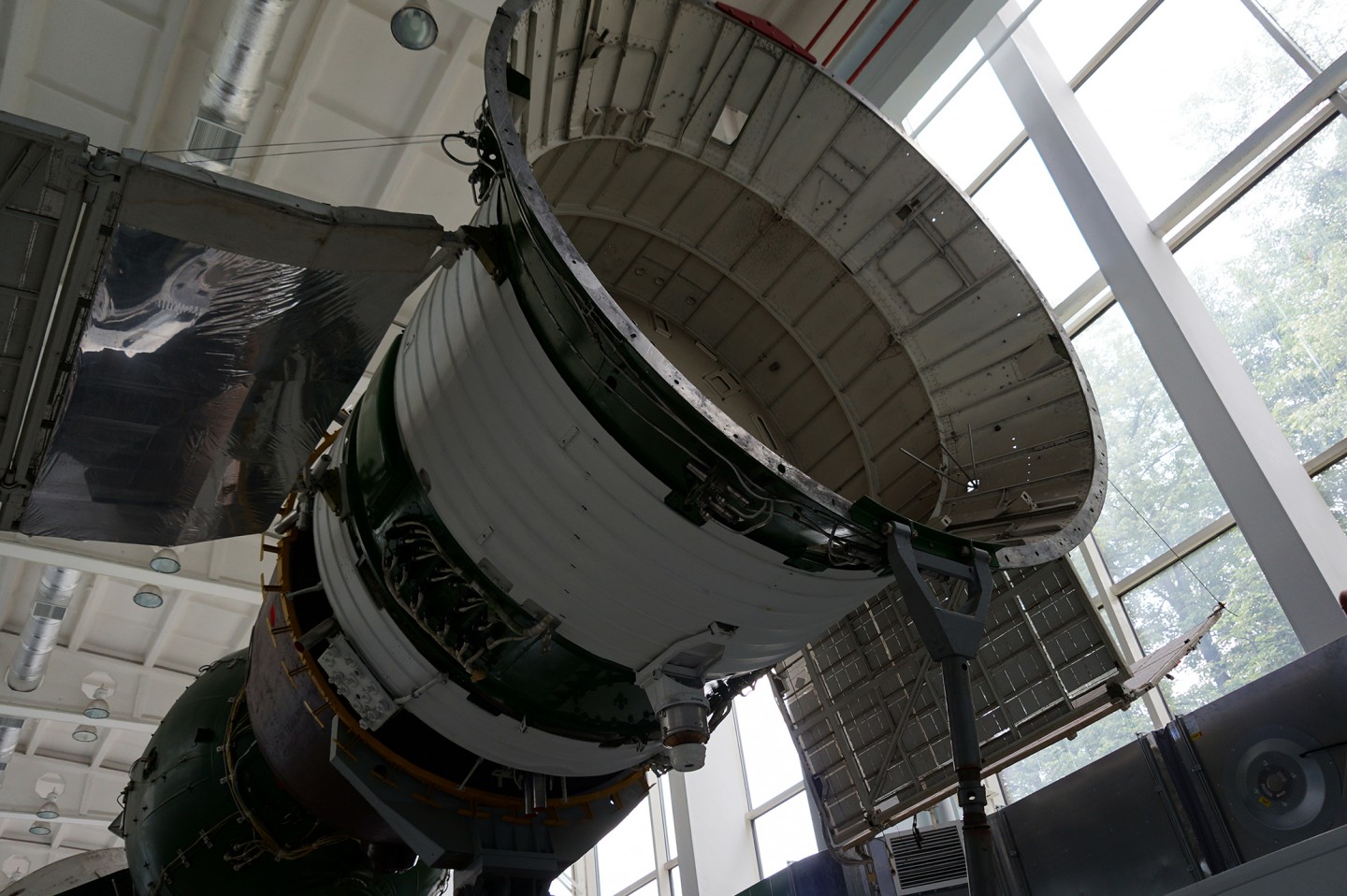 Рядом с макетом станции можно увидеть настоящий артефакт – элементы оригинальных солнечных панелей станции “Мир”, поврежденные микрометеоритами. Эти панели были сняты незадолго до затопления станции и спущены на землю на одном из последних шаттлов, посещавших станцию.