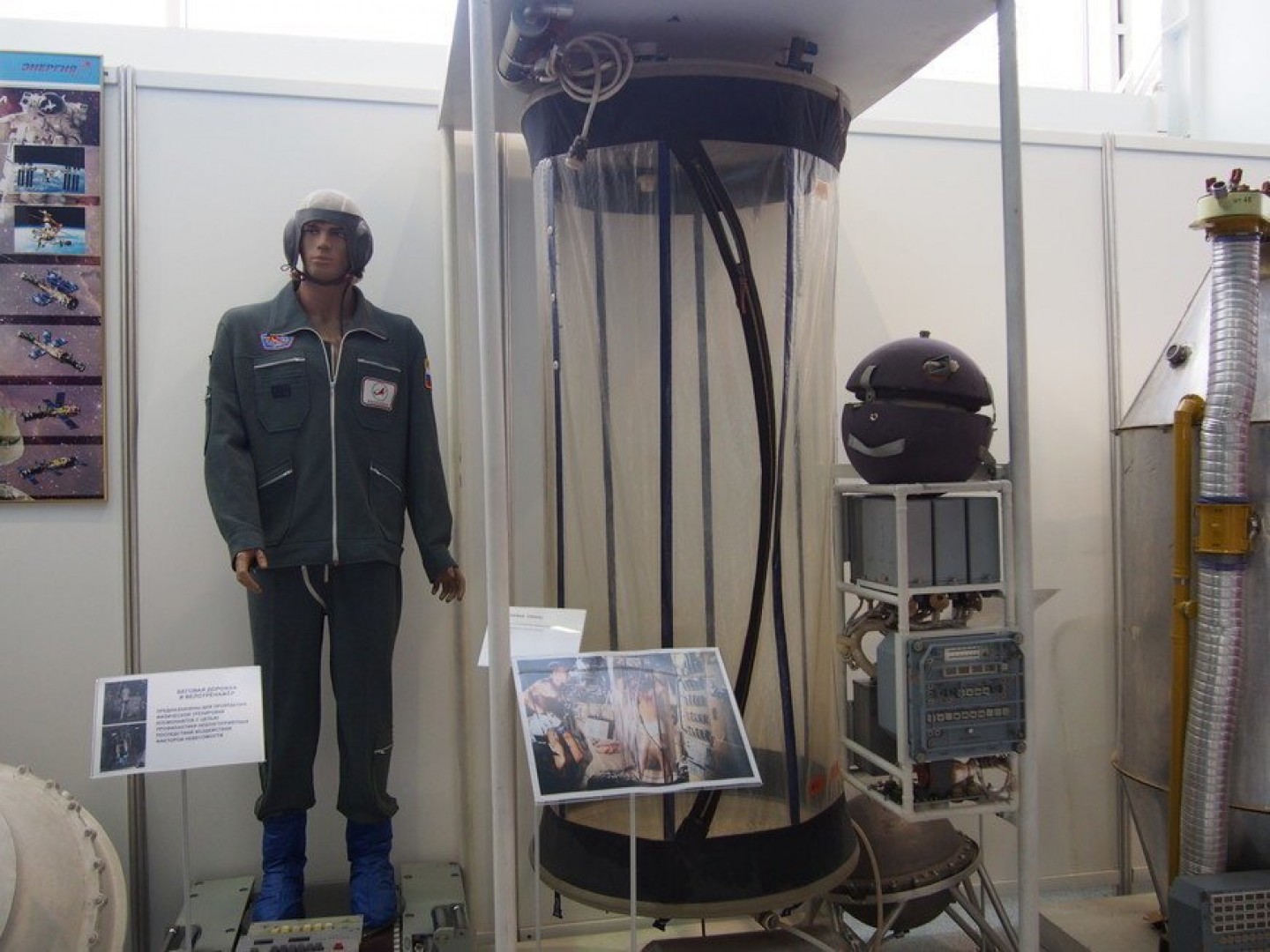 Здесь же выставлены различные модели скафандров для внутрикорабельной и внекорабельной деятельности, использовавшиеся во время полетов к “Миру”, в том числе скафандр, предназначенный для посадки на воду.