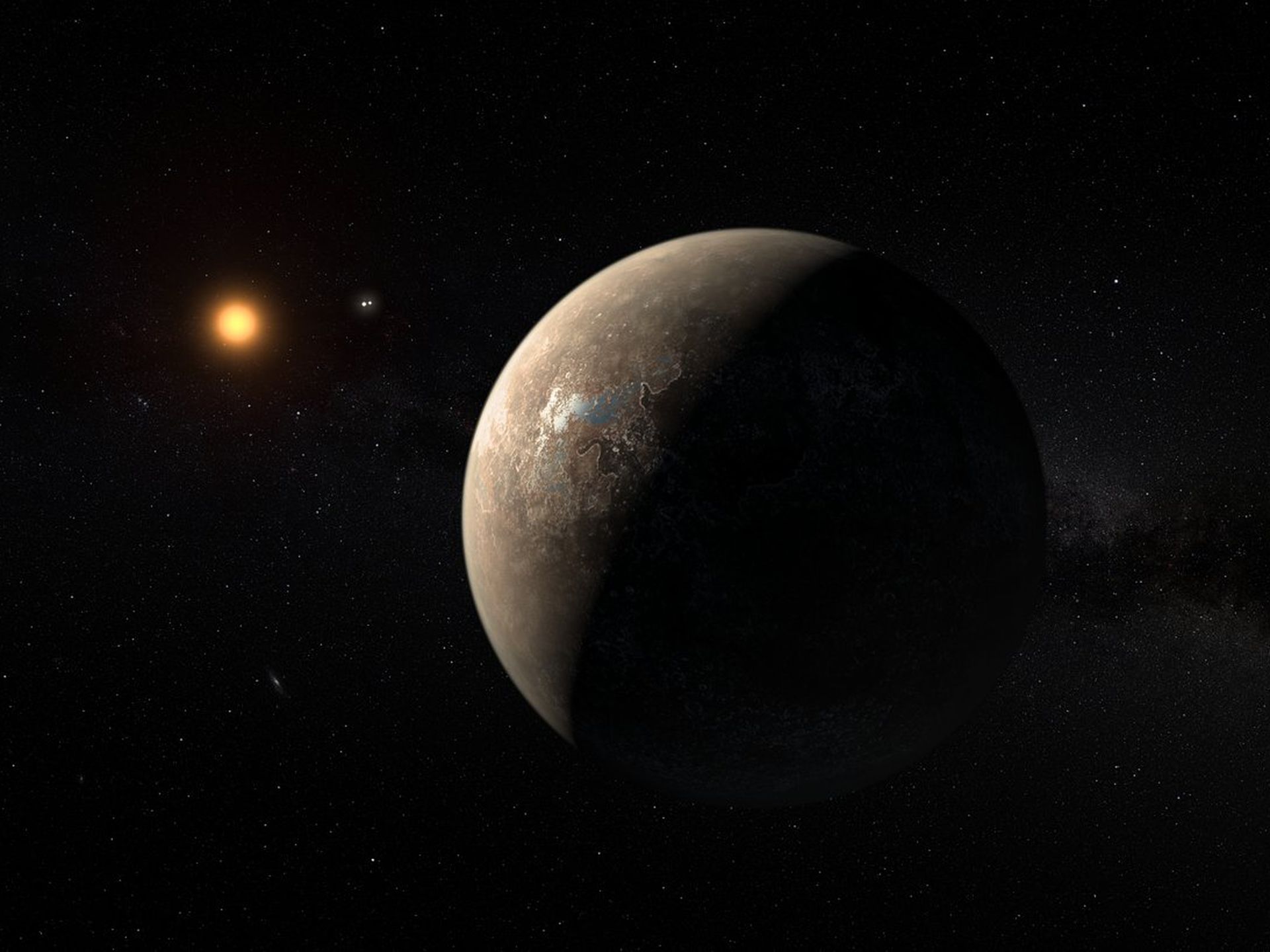 Представление о планете Proxima b, которая вращается вокруг ближайшей к Солнцу звезды. Credit: ESO/M. Kornmesser