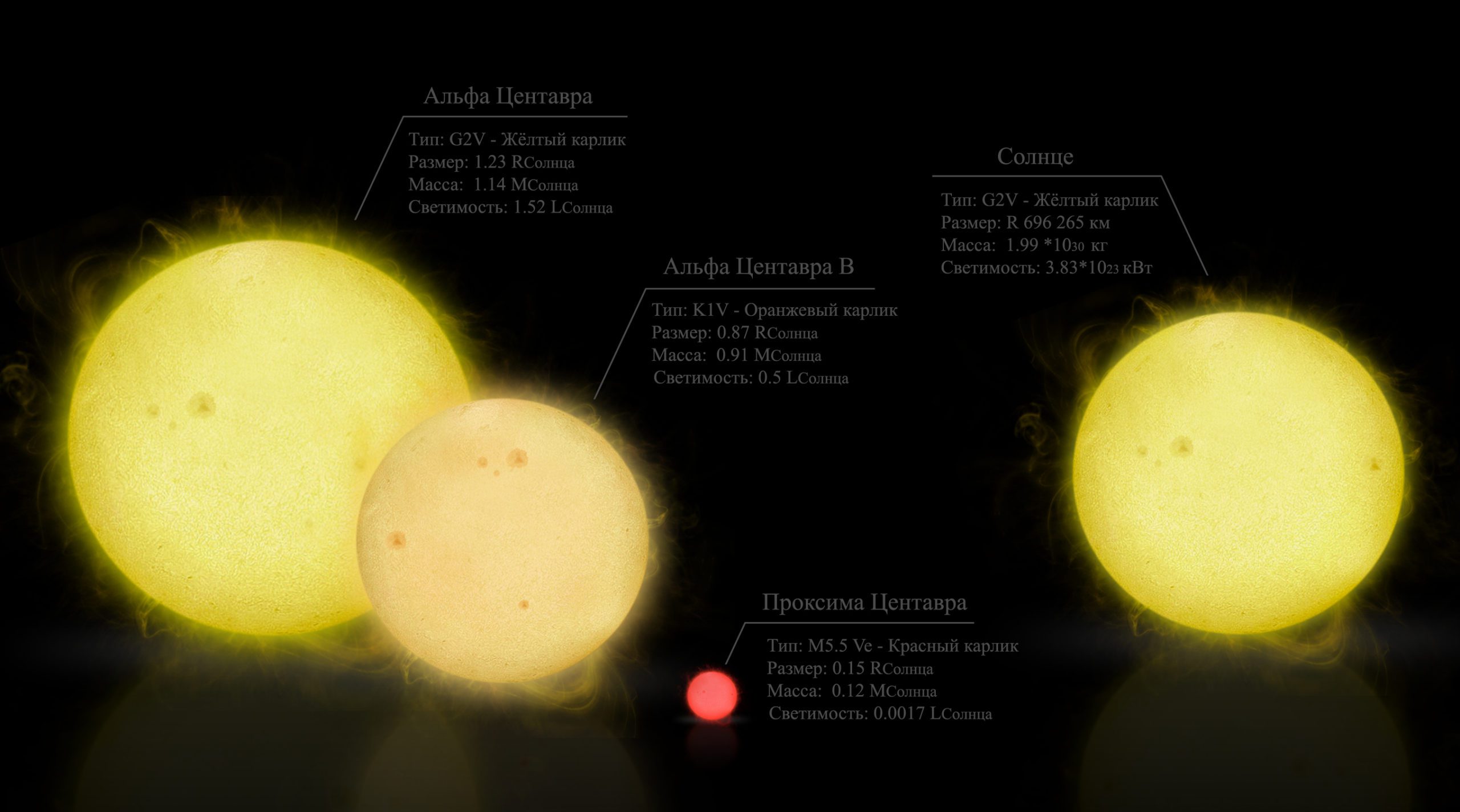 На самом деле одиночные звёзды вроде нашего Солнца встречаются не так уж и часто. Большинство звёздных систем – двойные. Система Альфа Центавра состоит из двух звёзд: Альфа Центавра А – звезды спектрального класса G, которая чуть больше и чуть ярче Солнца; и Альфа Центавра Б – звезда спектрального класса K, которая наоборот, чуть меньше и чуть тусклее.