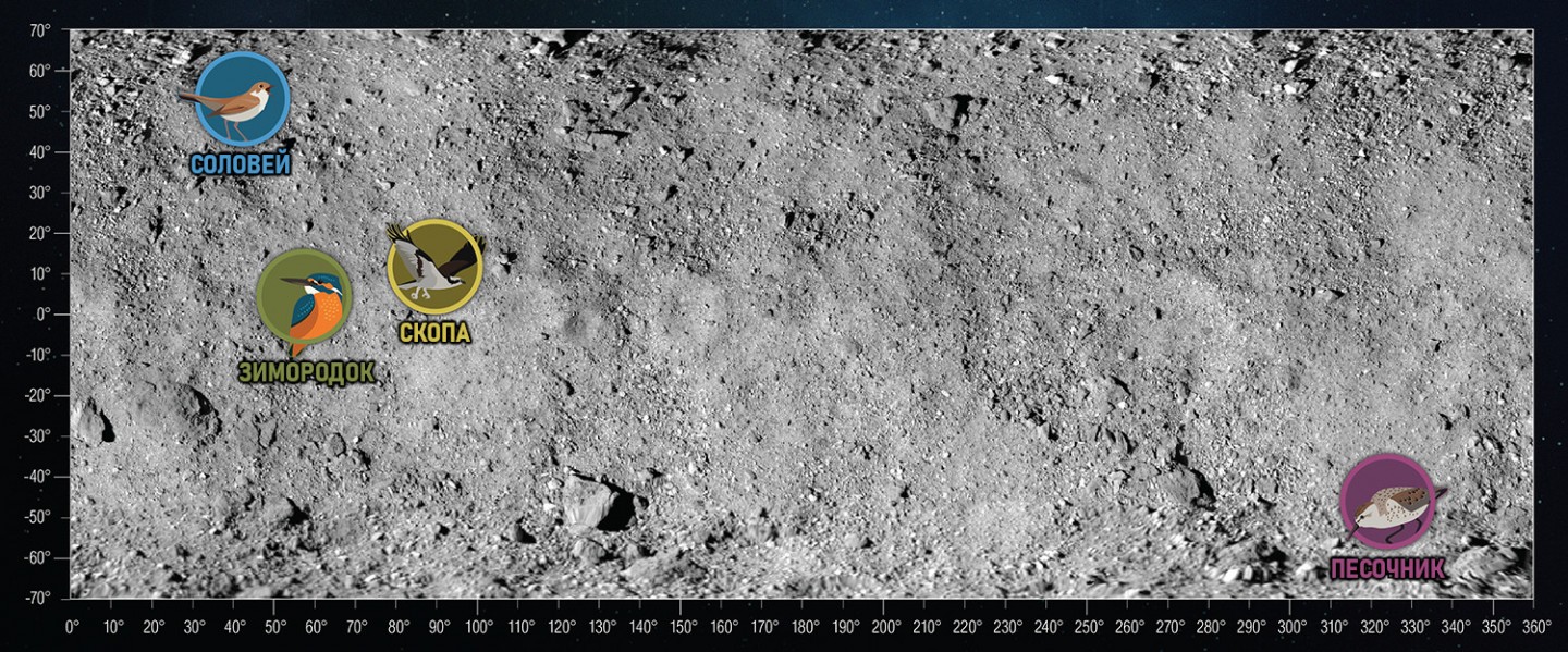 На этой плоской проекционной мозаике астероида Бенну показаны относительные местоположения четырех возможных мест сбора образцов на астероиде: Соловей, Зимородок, Скопа и Песочник. Космический корабль НАСА OSIRIS-REx планирует приземлиться на одном из этих четырех участков, чтобы собрать образец грунта летом 2020 года.