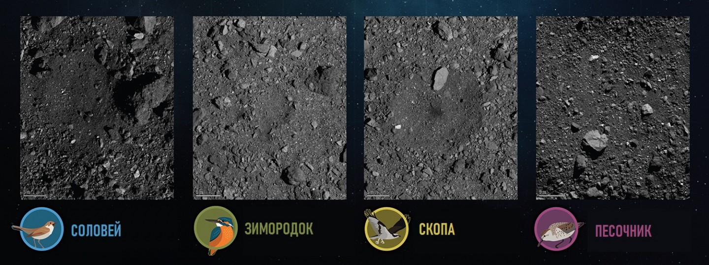 Последние четыре места-кандидата отбора образцов на астероиде Бенну обозначены как Соловей, Зимородок, Скопа и Песочница. Окончательное место будет выбрано в декабре 2019 года.