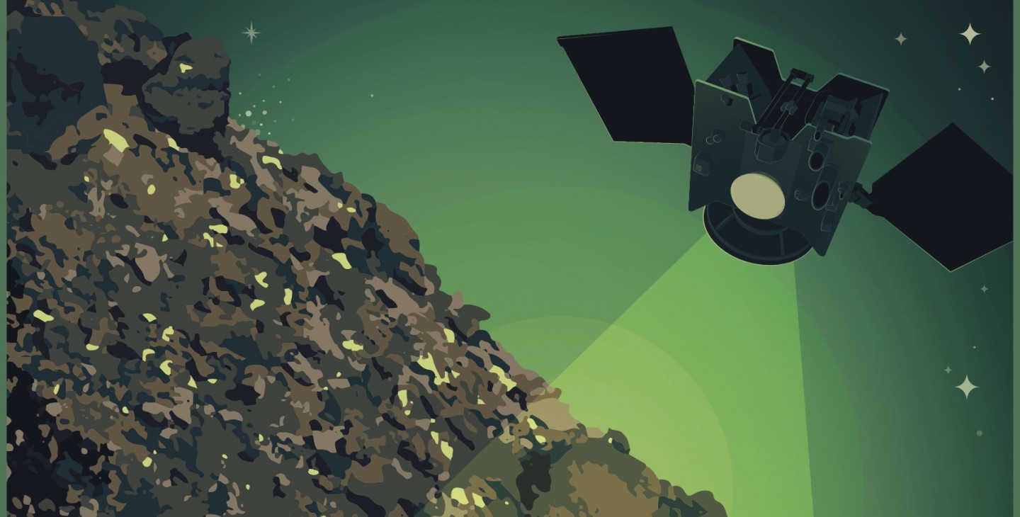 Изображение аппарата OSIRIS-REx во время сканирования поверхности астероида Бенну. Часть плаката посвященного выбору места для взятия образцов.