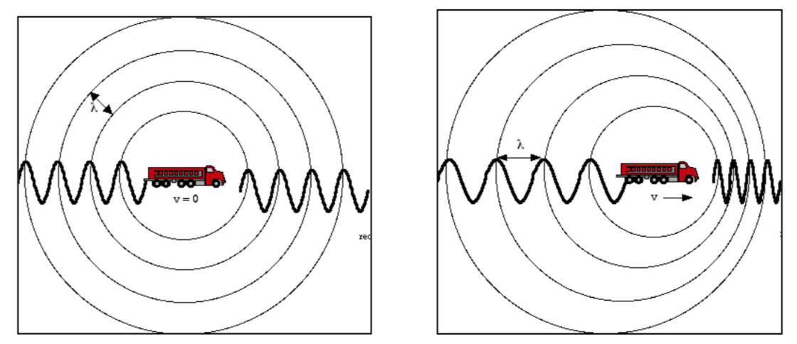 Однако, если пожарная машина начнёт движение в каком-либо направлении, наблюдаемая частота звуковых волн станет неравномерной из-за разницы длин волн. В обоих случаях звуковые волны имеют одинаковую частоту. Однако, поскольку источник звука теперь движется, центр каждой новой волны слегка смещается в направлении движения пожарной машины (хорошо показано в правой части рисунка выше). В результате в передней части машины звуковые волны начинают кучковаться, тогда как позади они разлетаются в стороны. Это и называется эффектом Доплера. Поскольку спереди и сзади автомобиля длина волн различна, то различной будет и их частота для наблюдателя. Наблюдатель перед источником звука будет слушать волны более высокой частоты, нежели его коллега позади источника. Изменение наблюдаемой частоты – это и есть изменение высоты звука сирены. Наблюдаемая частота ƒ может быть рассчитана по следующей формуле:
