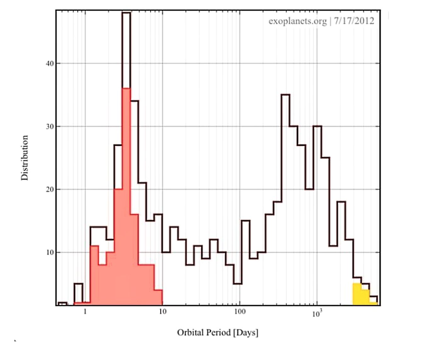 На графике также видны две цветные секции. Небольшая жёлтая секция показывает планеты, которые идентичны Юпитеру, то есть имеют похожую на него массу и орбитальный период. Большая красная секция показывает так называемые “горячие Юпитеры” — они имеют юпитерианские размеры, но их орбитальный период гораздо меньше, что означает, что они вращаются очень близко к своей звезде. А значит получают большое количество энергии, которая и разогревает их. Большинство из этих миров вращаются на орбитах меньших, чем у Меркурия — самой близкой к Солнцу планете. На графике показано 125 “горячих Юпитеров”, в то время как аналогов – всего 11. Это был один из самых больших сюрпризов в поисках экзопланет.