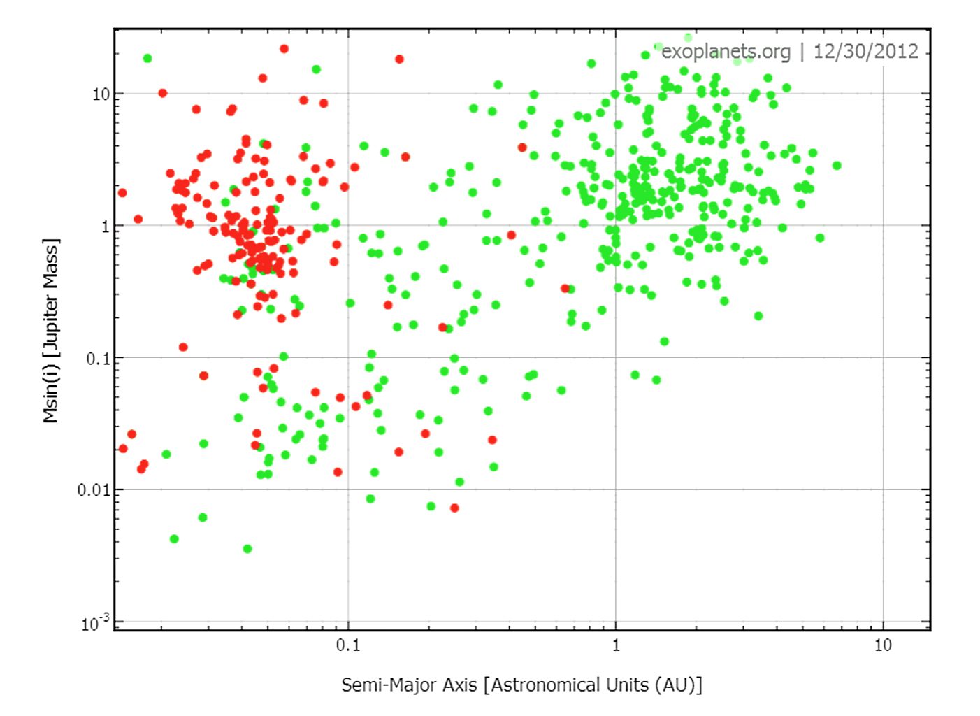 Но самой интересной особенностью графика 3 является наличие пробелов. Тот факт, что мы не видим никаких планет в правом нижнем углу (до 0,01 масс Юпитера), довольно поразителен — там должны быть каменистые планеты. Если бы мы внесли в этот график Венеру и Землю, то они были бы одинокими точками в нижней его части. Ни одна из планет Солнечной системы не попадает в левую группу. Кроме того, между двумя основными группами также имеется пробел. Неужели такова действительность? Действительно ли планеты, подобные Земле, так редки? Или же всё, что мы видим — это систематическая ошибка отбора, связанная с нашими методами обнаружения внесолнечных миров?