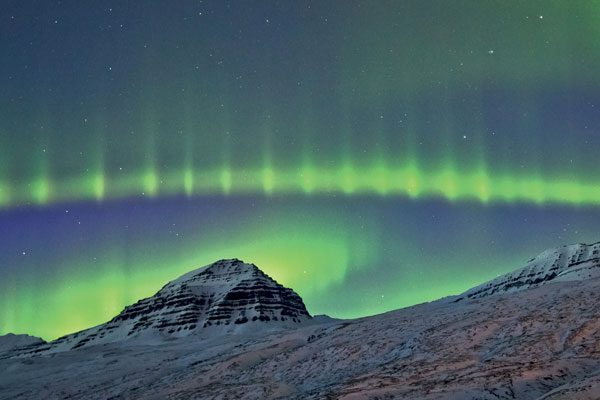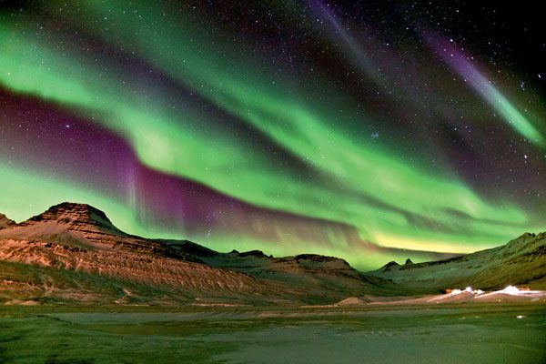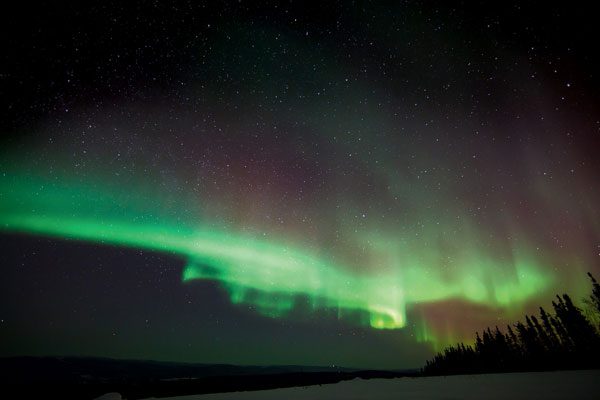 Одиночна дуга яскравістю 2 бали на початку суббурі. Стійкі дуги полярних сяйв можуть сягати зі сходу на захід на тисячі кілометрів. На цій фотографії видно розподіл кольорів по висоті. Нижня межа світіння, приблизно в 100 кілометрах від поверхні землі, забарвлена атомами кисню в яскраво-зелений колір. Вище 150 кілометрів атоми кисню дають червоне світло, як і атоми водню, цим пояснюється фіолетовий відтінок верхньої частини стрічки. Крім того, ця область підсвічена променями Сонця, яке зайшло за обрій. Нижче 100 кілометрів атмосфера стає настільки щільною, що заряджені частинки туди просто не долітають. При найсильнішій сонячній активності полярні сяйва можуть спостерігатися на висоті 90 кілометрів.
