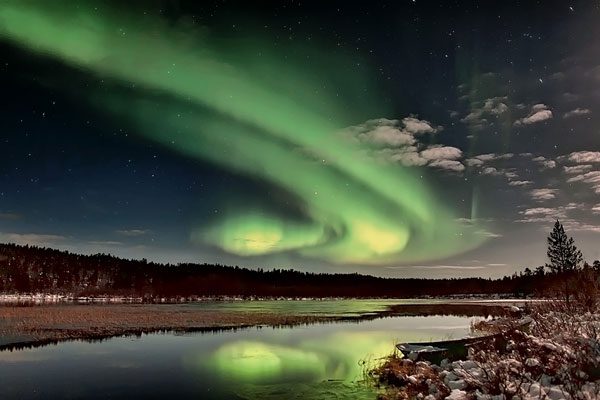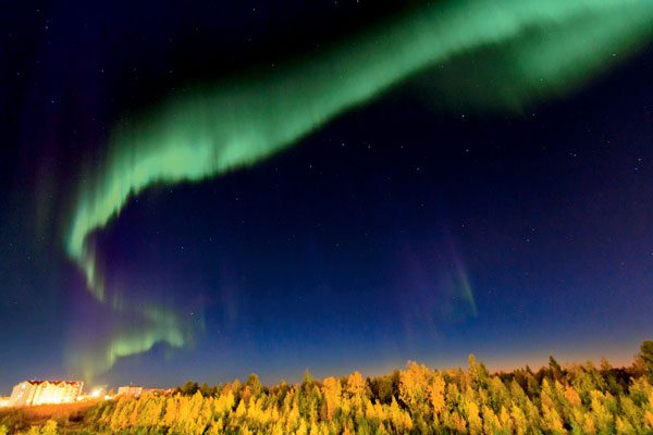 Центр зони полярних сяйв, розпал суббурі. Місцевий час близько опівночі, яскравість світіння – 2-3 бали. Фотографія зроблена 22 березня 2012 року підчас спеціального туру для мисливців за північними сяйвами. Цей новий вид туризму активно розвивається в Скандинавії, Канаді, на Алясці та в РФ.