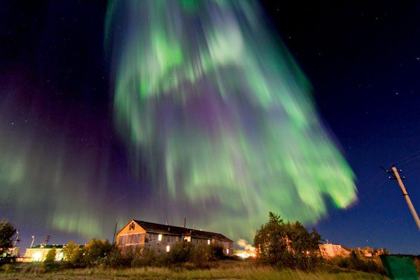 Полярні сяйва яскравістю 1-2 бали зазвичай не здаються різнокольоровими: інтенсивність окремих кольорів нижче порога сприйняття людського ока. Сяйва в 3-4 бали зазвичай є жовтувато-зеленими. Висока інтенсивність даного полярного сяйва дозволила побачити його структуру при досить короткій витримці. Рідкісний за красою епізод: комбінація жовтого, зеленого і червоного світіння при певному ракурсі дає фіолетові фарби. Ми бачимо сплеск активності на завершальній стадії суббурі. Час далеко за північ, яскравість – 3 бали. Фотографію зроблено на південь від зони полярних сяйв. Сяйво близько до зеніту і його промені візуально сходяться в одній точці, подібно до рейок, на горизонті.