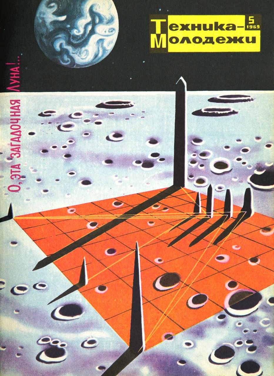 Высокая стела возвышается над поверхностью с глубокими кратерами, отбрасывая длинную зловещую тень на башни поменьше. Прямые линии, похожие на улицы на карте, соединяют эти структуры друг с другом, как будто на доске для космических шахмат. Земля безмятежно плывет в темном небе, на котором размещена надпись «Техника-молодежи» – логотип советского научно-популярного журнала, основанного в 1933 году. На обложке журнала 1969 года была показана статья с фотографиями Луны. 9, советский беспилотный космический корабль, который первым пережил посадку на Луну несколькими годами ранее. Обложка номера 5 за 1969 год стала иллюстрацией к статье с фотографиями, снятыми советской автоматической межпланетной станцией «Луна-9», которая за несколько лет до этого первой совершила мягкую посадку на поверхности Луны.