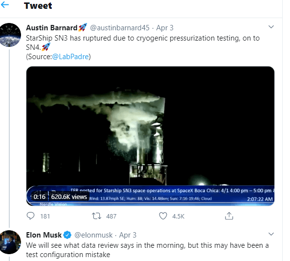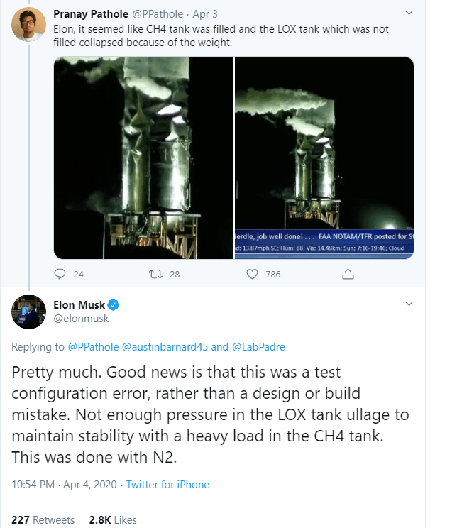 В своем объяснении Маск рассказал, что Старшип SN 3 разрушился, потому что нижний резервуар (с жидким кислородом) не находился под давлением, достаточным для того, чтобы выдерживать нагрузку метанового резервуара, полностью загруженного жидким азотом. Объяснение Маска звучит так, как будто один, или несколько человек, не смогли учесть тот факт, что жидкий азот почти на 25% тяжелее криогенного метана, который он имитировал.