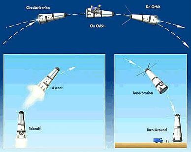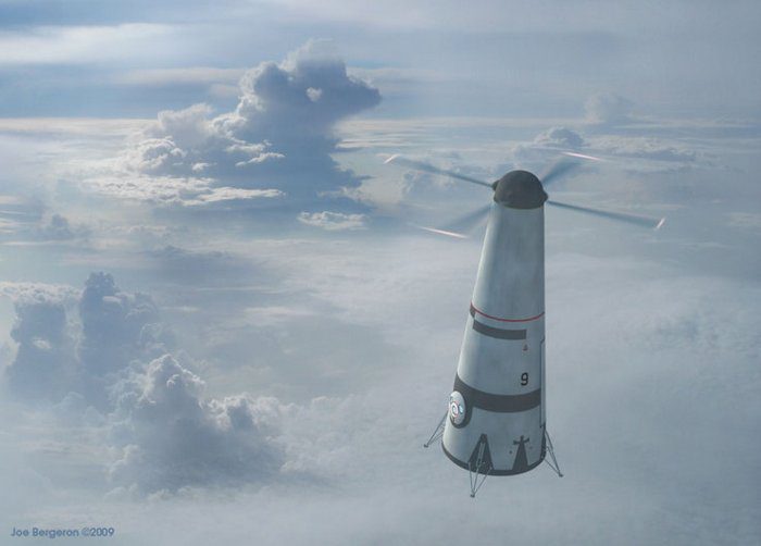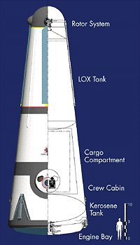 На ранней стадии полета лопасти винта, вращаемые ракетными двигателями, создавали бы подъемную силу, достаточную для того, чтобы преодолеть нижние плотные слои атмосферы. В более высоких слоях атмосферы, где разреженный воздух уже не позволял использовать винт для набора высоты, аппарат должен был перейти на полет на основных ракетных двигателях. При этом вращающийся винт действовал бы как гигантский турбонасос, поднимающий горючее из баков, расположенных в нижней части аппарата. (*)
