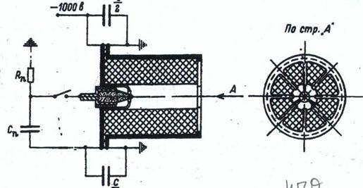 Конструкция у него была простейшая: два электрода да изолятор (кусок пластмассы, фторопласта) между ними. К электродам подключалось два конденсатора: один большой ёмкости на напряжение примерно в 1 кВ, а второй – очень малой ёмкости, но на десятки киловольт. Первый всегда соединён с электродами, а второй может замыкаться и размыкаться.