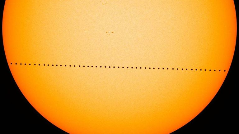 Примерно тринадцать раз каждые сто лет, Меркурий проходит перед Солнцем во время пяти с половиной часового транзита, который можно наблюдать с Земли. Астрономы профессионалы и любители могут наблюдать в бинокли или телескопы со специальными солнечными фильтрами, как планета медленно перемещается на фоне звезды.