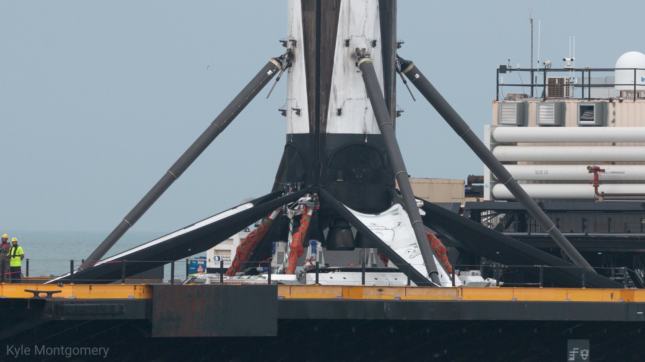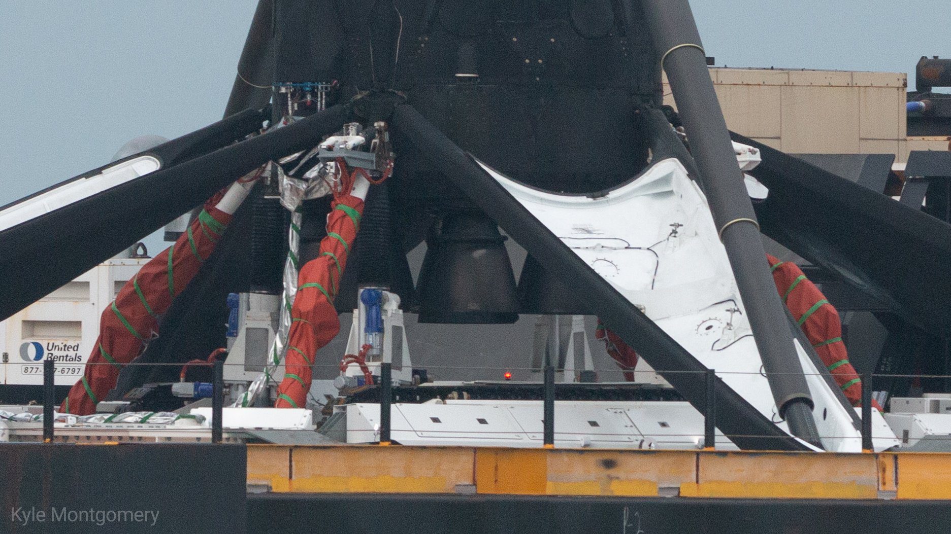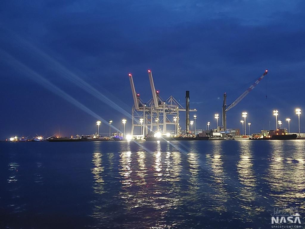 Сейчас они уже у причала. И при достаточно близком рассмотрении, ступень выглядит совсем неплохо, особенно для той, что совершила уже 5 вояжей за границы атмосферы и 5 раз возвращалась домой.