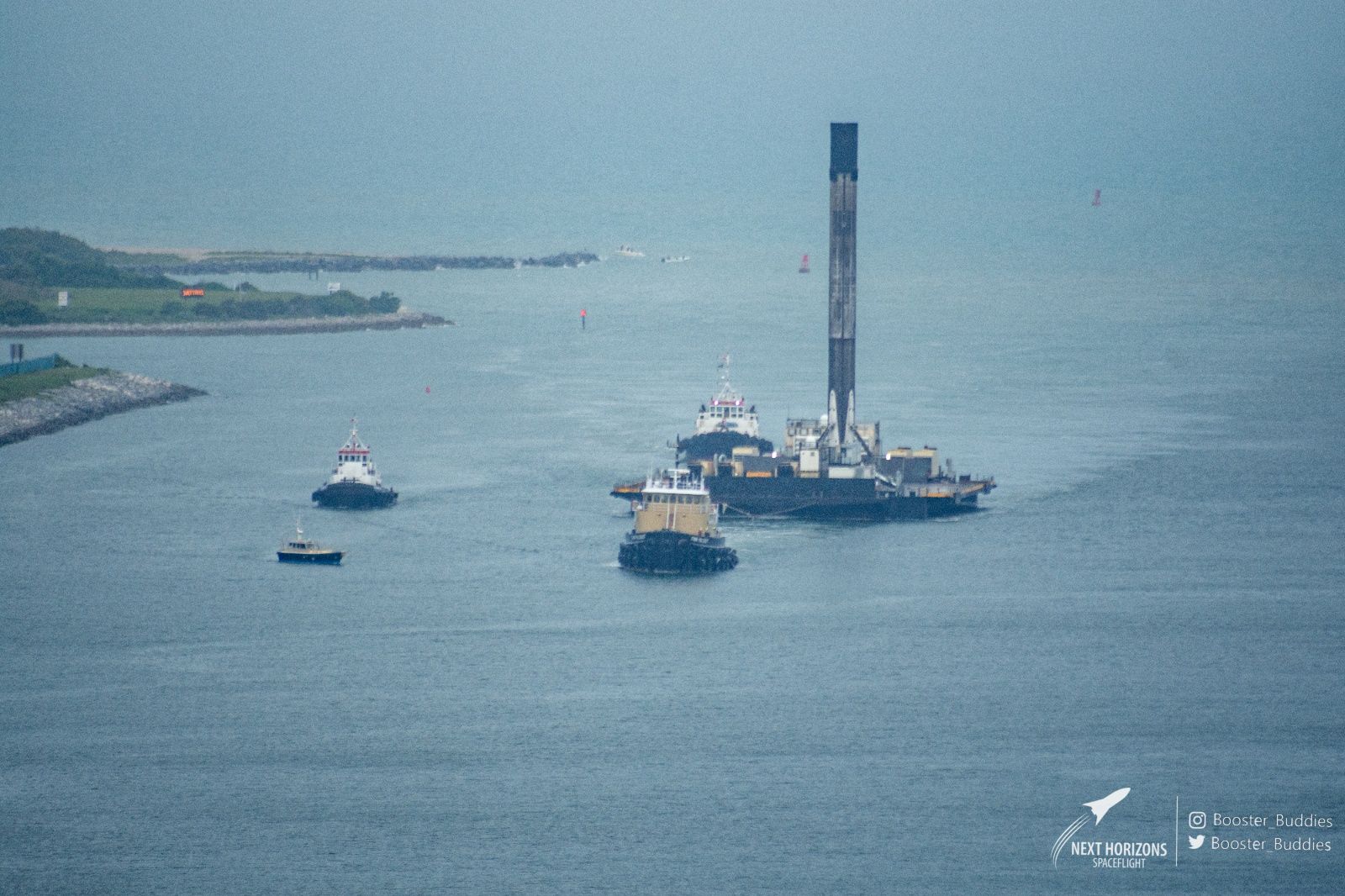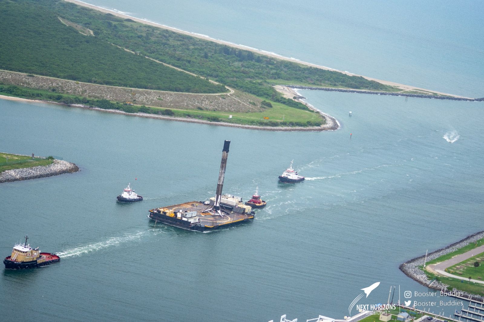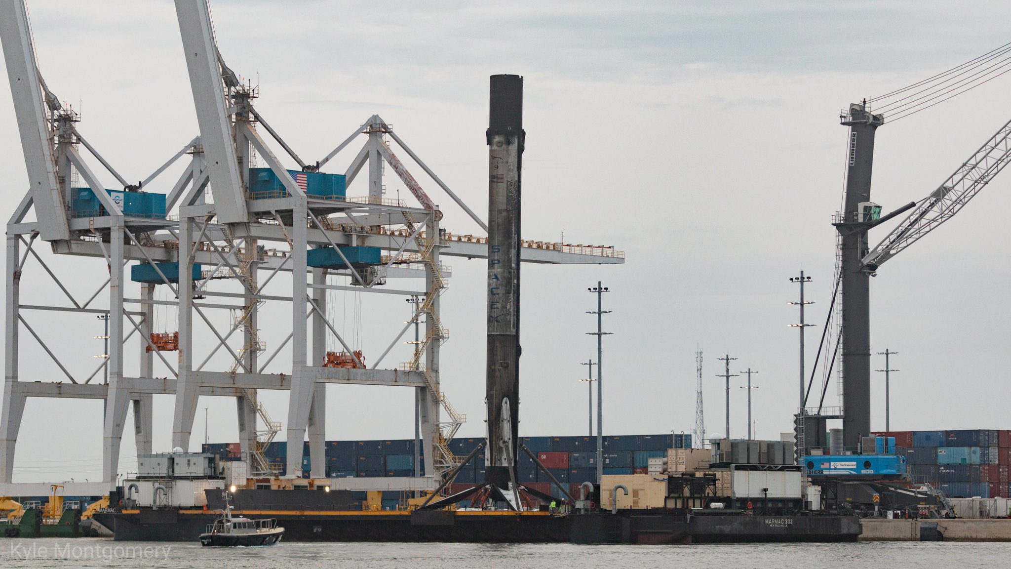 Сейчас они уже у причала. И при достаточно близком рассмотрении, ступень выглядит совсем неплохо, особенно для той, что совершила уже 5 вояжей за границы атмосферы и 5 раз возвращалась домой.