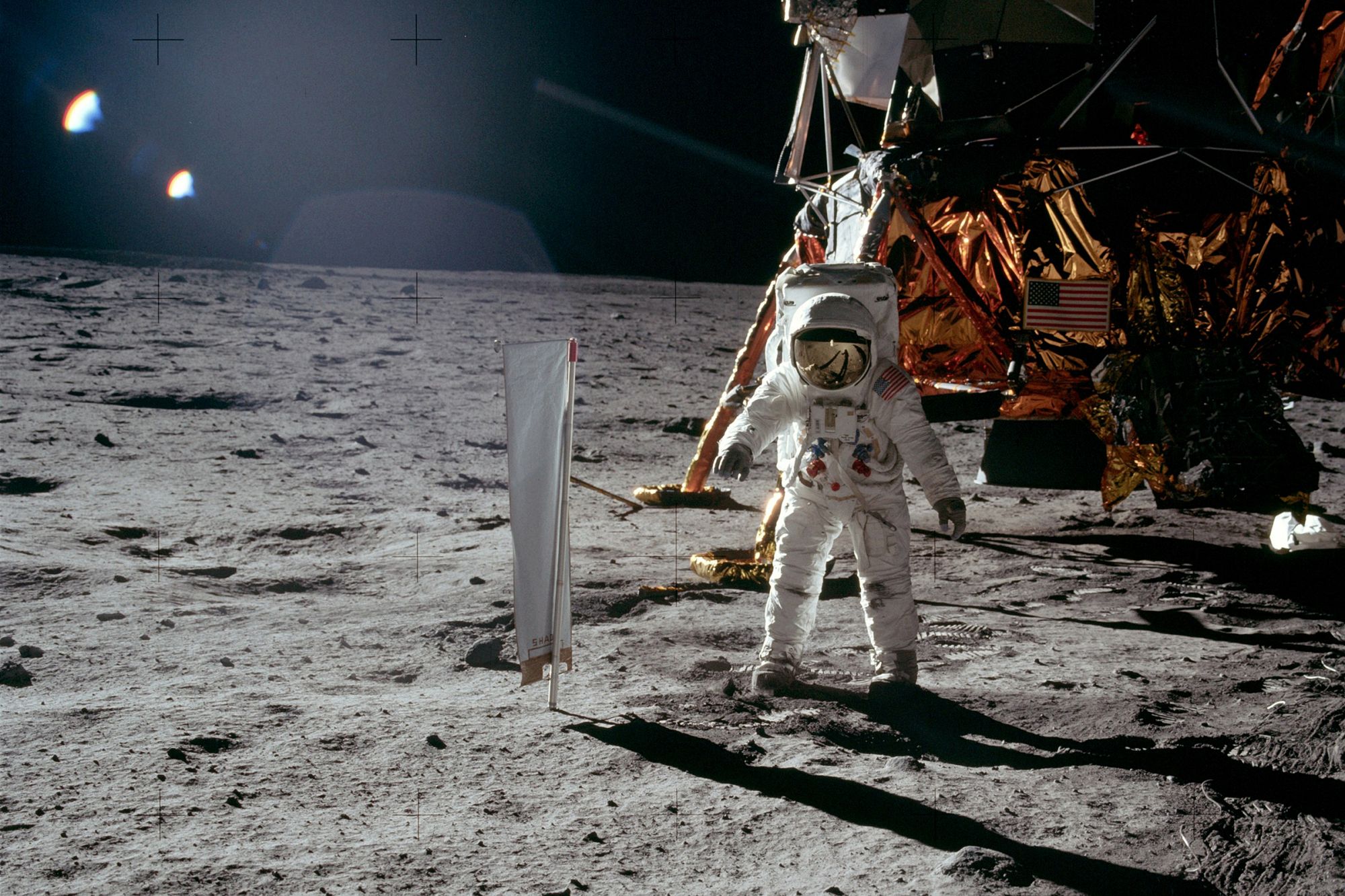 Экспедиции Аполлонов высаживались в местах, близких к линии терминатора, вскоре после восхода солнца над горизонтом. От того и тени на фотографиях такие длинные, от того длинные тени так чувствительны к неровностям поверхности. От того и блики на линзах фотокамер. Очень классных камер фирмы Хассельблад.