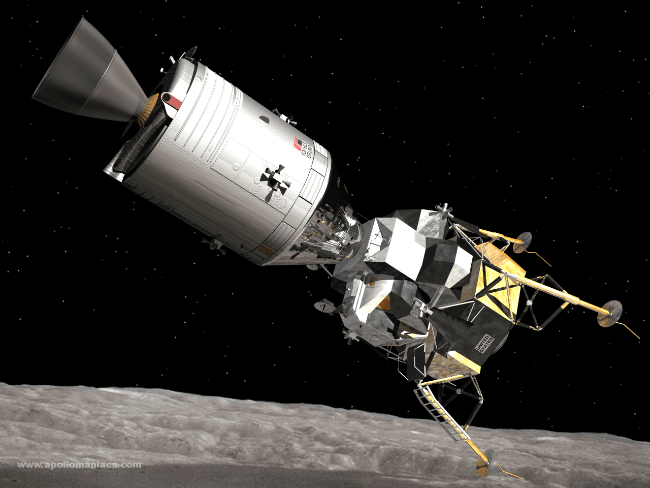 Хорошо видны конусный обитаемый (командный) модуль, цилиндрический служебный модуль, с огромным соплом мощного ракетного двигателя, и лунный модуль.