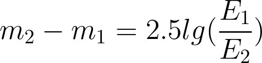 - Колькасьць сонцападобных зорак мы можам узяць з масы (пазначым як N). Сьвяцільнасьць такой групоўкі будзе раўняцца колькасьці зорак памножаных на свяцільнасьць сонца. А бачную зорную велічыню знайдзём з дапамогай формулы Погсана. E – асьветленасьць (шчыльнасьць сьветлавога струменя), m – бачная зорная велічыня (у Сонца -26.7). Скарыстаўшыся дадзенымі ніжэй формуламі, атрымваем адказ m = 3.225.