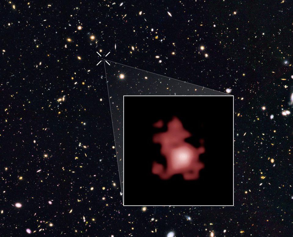 Это галатика GN-z11, свет от которой шёл до нас 13,4 млрд световых лет: –>он был испущен спустя всего 400 млн световых лет после Большого взрыва<–