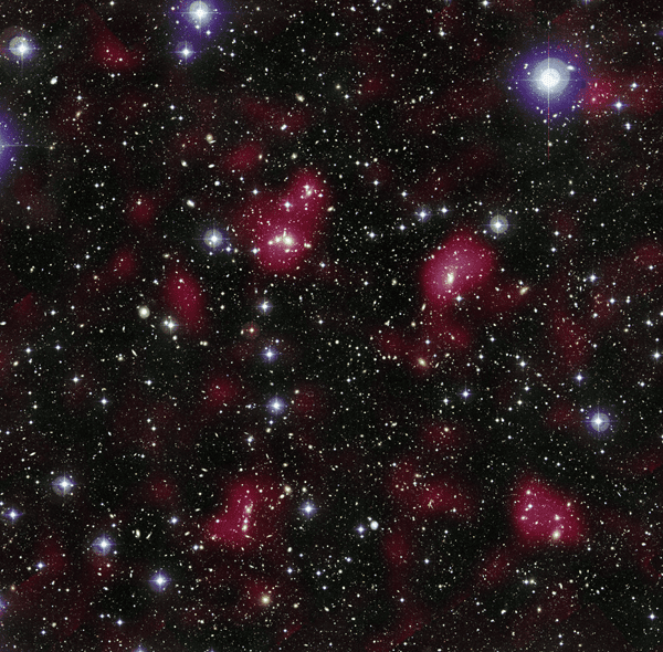 Сверхскопление Abell 901/902 содержит сотни галактик и огромное количество темной материи. Пурпурным показано распределение темной материи, полученное из наблюдений космического телескопа Хаббла и наложенное на изображение сверхскопления от наземной обсерватории.