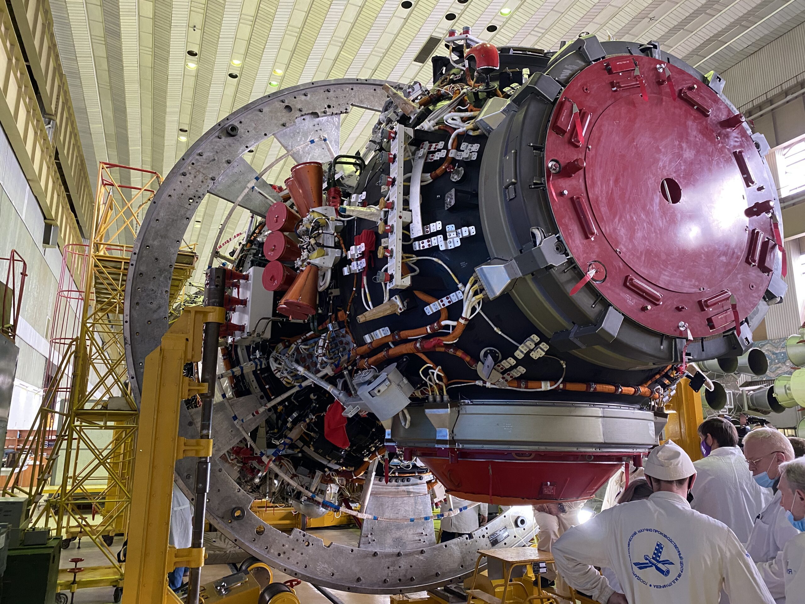 Сам МЛМ в специальной оснастке проходит последние процедуры перед погрузкой. Уже упакованы солнечные батареи и другие элементы, которые будут установлены на него только после финальных испытаний на Байконуре. Модуль пока выглядит “голым”. Все системы, которые не вписываются в габариты транспортировочного оборудования, на него пока не установлены, говорит нам зам гендиректора Центра имени М.В. Хруничева Роман Хохлов. Это солнечные батареи, панели терморегулирования, панели микрометеоритной защиты, вакуумная термоизоляция. Все элементы, которые должны быть бережно сохранены – сопла двигателей, антенны, места крепления оборудования – закрыты специальной технологической защитой, которую представители отрасли называют “краснотой”. При подготовке изделия к полету эти защитные элементы снимут.