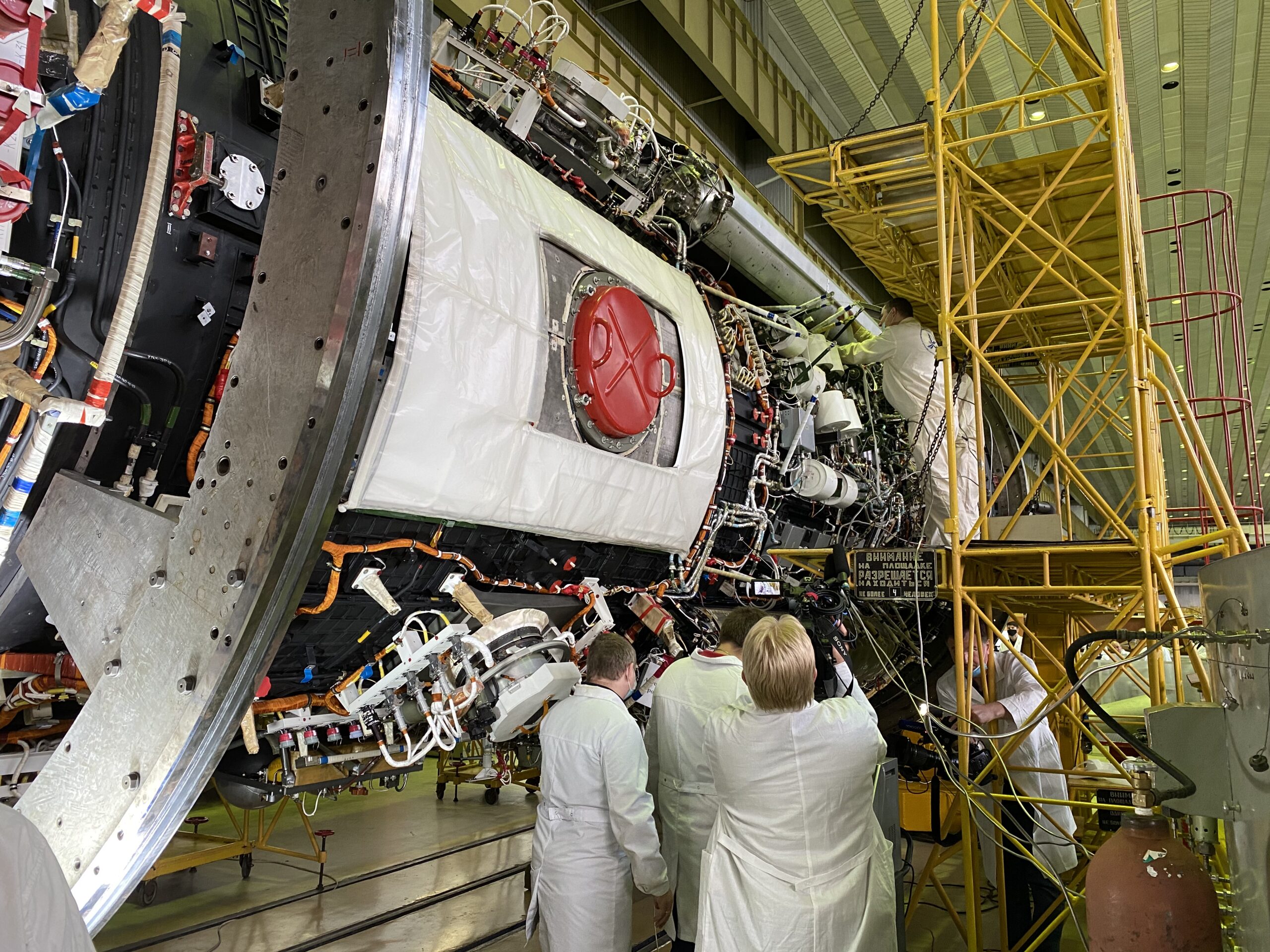 Работа с модулем во время нашего визита не прекращается. Специалисты Центра бережно обматывают все выступающие элементы защитными поролоновыми лентами (и да, их закрепляют синей изолентой!), наносят антистатик на отдельные детали, исправляют последние найденные замечания. Журналисты центральных каналов с камерами, которые давно поняли, что главный принцип таких презентацией – успеть первым, обступают объясняющего свои действия сотрудника плотной стеной. Теперь мне понятно, почему среди журналистов столько рослых людей – даже встав на цыпочки, я не могу нормально сфотографировать происходящее. Добрый специалист Центра, поглядев на мои мучения, приносит мне табуреточку 🙂