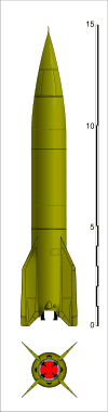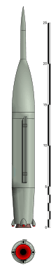 Ракета, так и оставшаяся на бумаге, была первой попыткой уйти от темы Фау. Предпологалась дальность в 3000км(не очень реалистично, на мой взгляд…).Неизвестно назначение и конструкция боковых движков малой тяги, скорее всего-управляющее .
