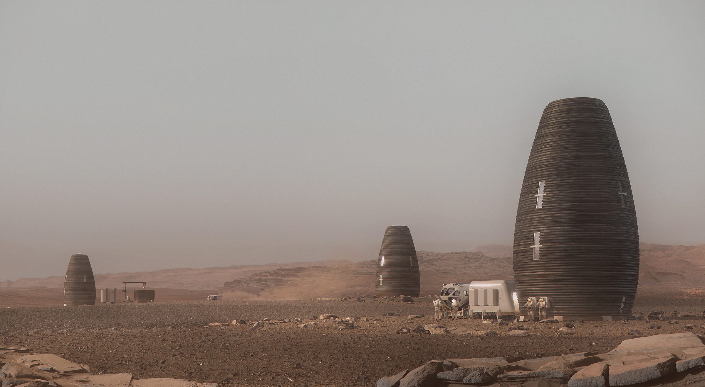 Напечатанный слой спёкшегося грунта толщиной в пару метров позволит не только создать надёжную внешнюю конструкцию, которая будет способна обойтись без герметизации раскладной жилой платформы внутри грузового отсека (так как несущая наружная стена позволит надёжно герметизировать грузовой отсек, а также обойтись встроенным в корпус шлюзом – для полной герметизации и замены марсианской атмосферы на необходимую колонистам усилиями системы жизнеобеспечения), но и создать внешние конструкции, по типу интегрированных лестниц или крытых проходов между “небоскрёбами”.