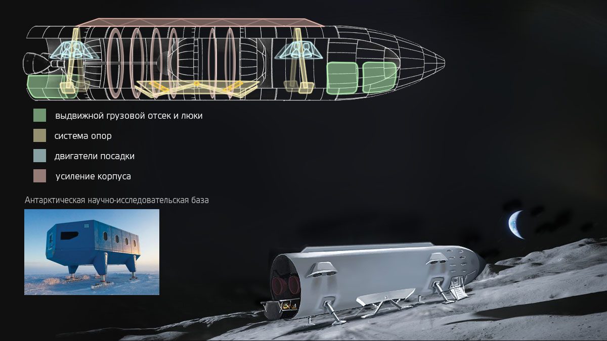 А что если одноразовый старшип для луны будет садится плашмя? Будут использоваться все равно дополнительные маломощные двигатели, их можно разместить в четырех точках по сторонам, сильно усиливать корпус не надо, так как не надо взлетать повторно и сила тяжести на луне в 6 раз меньше. Зато плюсы в доступе в корабль позволят доставить крупные тяжелые грузы типа строительной техники, да и в самом корпусе возможно потом устроить базу. Будет даже в чем то похоже на антарктическую станцию по форме.