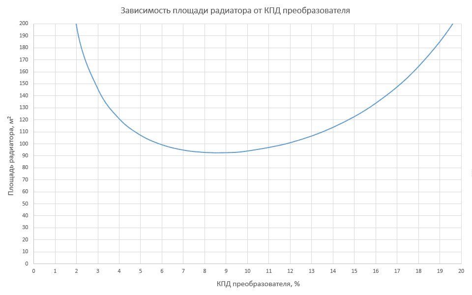 В наших предположениях оптимальный КПД оказывается 9%! При нём площадь радиатора составит 92,5 квадратных метра, температура – 1163 К (+890 градусов Цельсия), а рассеиваемая этим радиатором мощность – 9,1 МВт. Попытки поднять КПД выше 9% неизбежно приведут лишь к увеличению размеров и массы радиаторов. При преобразовании тепла с помощью турбин радиатор должен был бы сбрасывать в космос примерно 2,3 МВт тепла – в разы меньше, чем с термоэмиссионным преобразователем. Но из-за температуры всего в 400 К площадь этого радиатора должна была бы составить… более 1600 квадратных метров! Переход к термоэмиссии позволил снизить площадь в 18 раз! Ну или около того, т.к. взятые мною в расчётах “0,4 от максимального теоретического КПД преобразования тепла” – это лишь примерная оценка, а у реального преобразователя может быть и 0,3 (тогда оптимальный КПД всего 6%!) и 0,5 (тогда – 11%). Но в любом случае термоэмиссия требует радиатора, который меньше более чем на порядок.