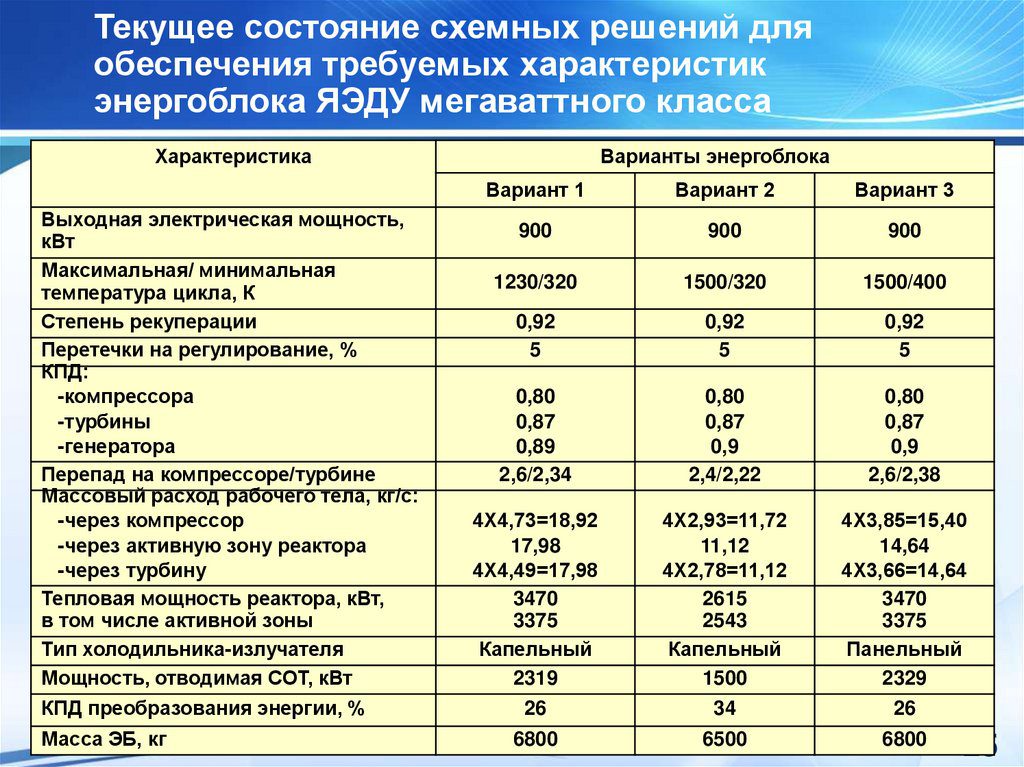 Дело в том, что эффективность преобразования тепла в любой другой вид энергии фундаментально ограничена. Максимальный возможный КПД равен (1 – Тхол/Тнаг)*100%, где Тхол – абсолютная (та, что в кельвинах) температура “холодильника” (в нашем случае – радиатора), Тнаг – абсолютная температура нагревателя (в нашем случае – активной зоны реактора). На практике КПД преобразования обычно эдак раза в два-три ниже. В частности тут у нас на слайде варианту №1 соответствует максимальный гипотетический КПД в 74,0%, а запланированы лишь 26%, для варианта №2 максимальный теоретический 78,7%, а запланированный – 34%, для варианта №3 – 73,3% и 26% соответственно.